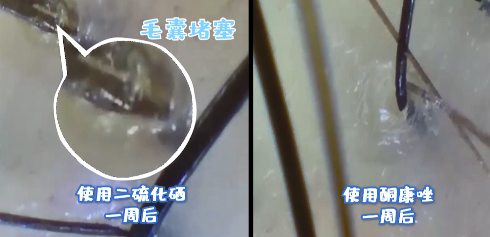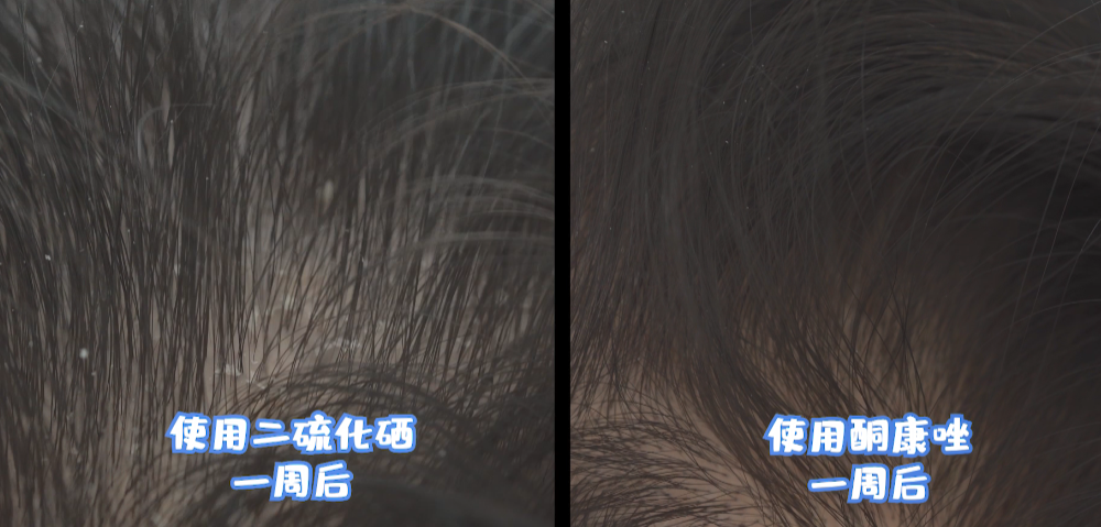 通过专业毛囊检测仪检测显示,使用二硫化硒的实验员,还有少许毛囊堵塞和头屑现象;使用酮康唑的实验员,头皮清爽不油腻,未发现毛囊堵塞现象,效果出色。